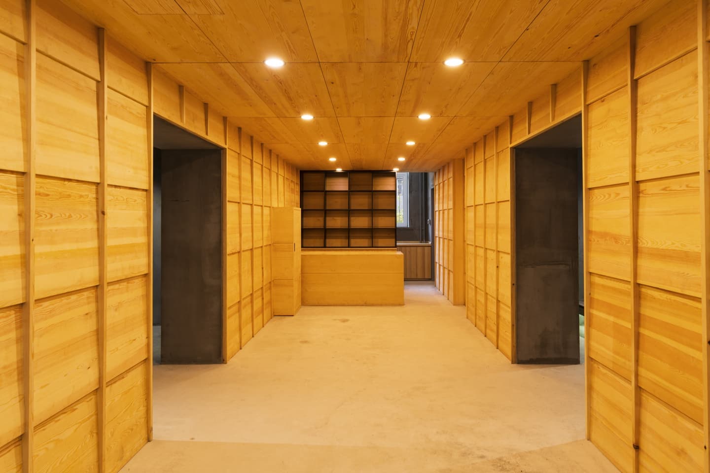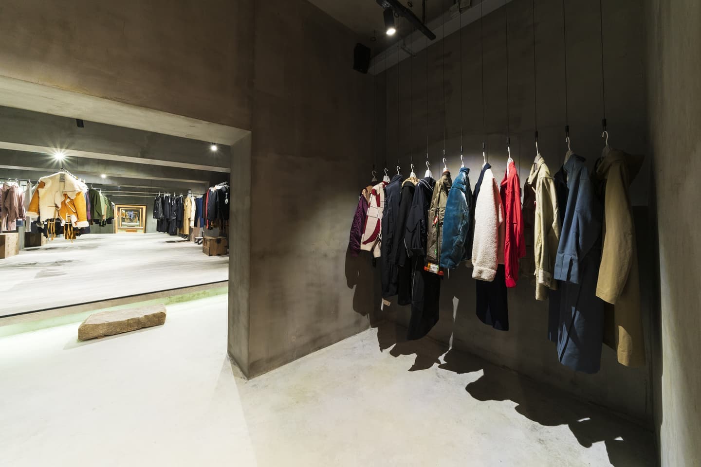 日本のファッションブランドを取り揃えるということから空間構成も “ 日本らしさ ” をコンセプトとした。ファサードやロビーは、日本の古家屋でよくみられる下見板で仕上げ、服が陳列される空間は、あくまでそこに並ぶ服を主役と捉えるためモノトーンの素材で統一した。そして、奥へと導かれる細長い通路やいくつもの部屋が連続する構成、背の低い開口、段差による空間分離といった日本建築特有の要素を取り込み直接的な演出ではなく、空間要素のみで “ 日本らしさ ” を表現した。